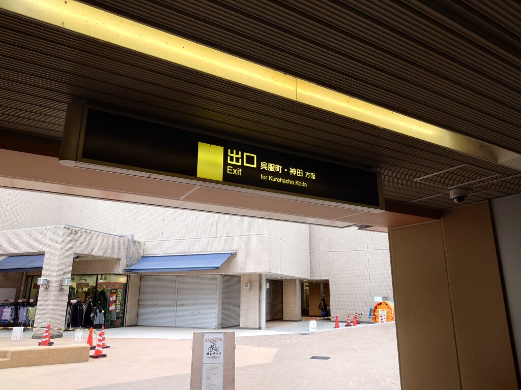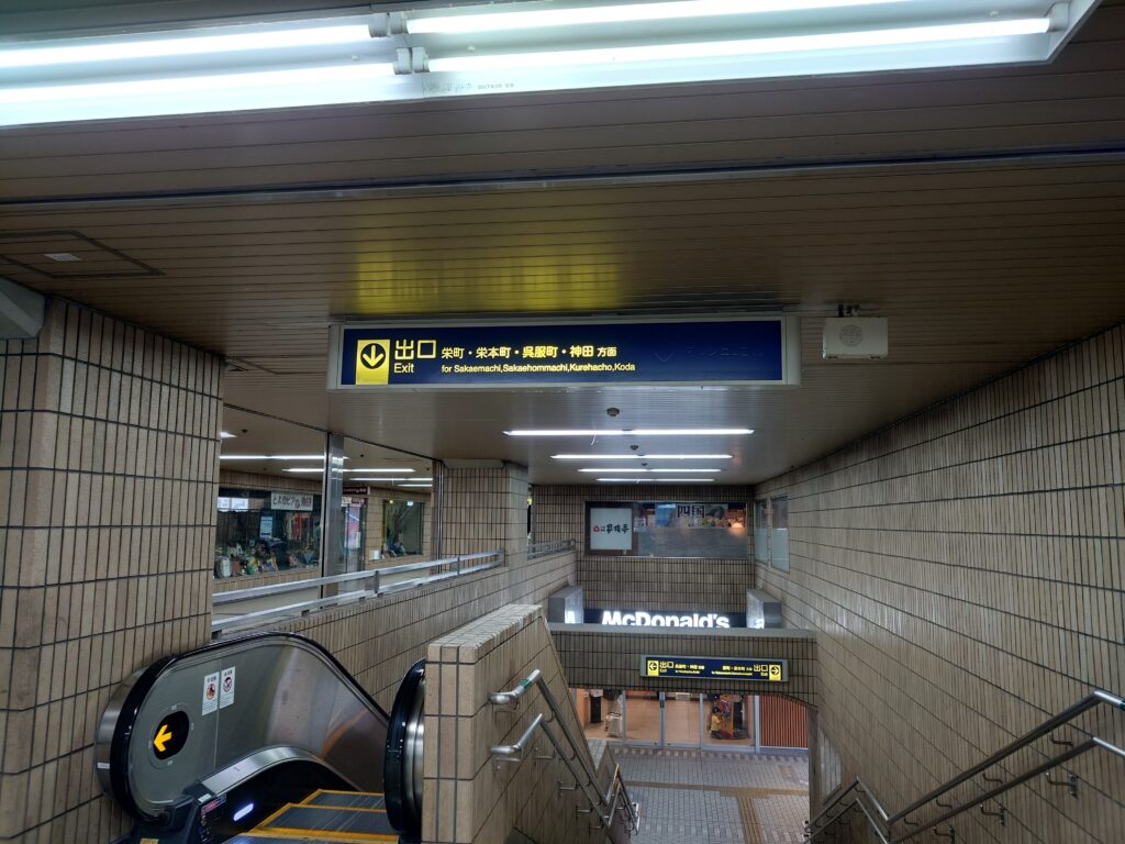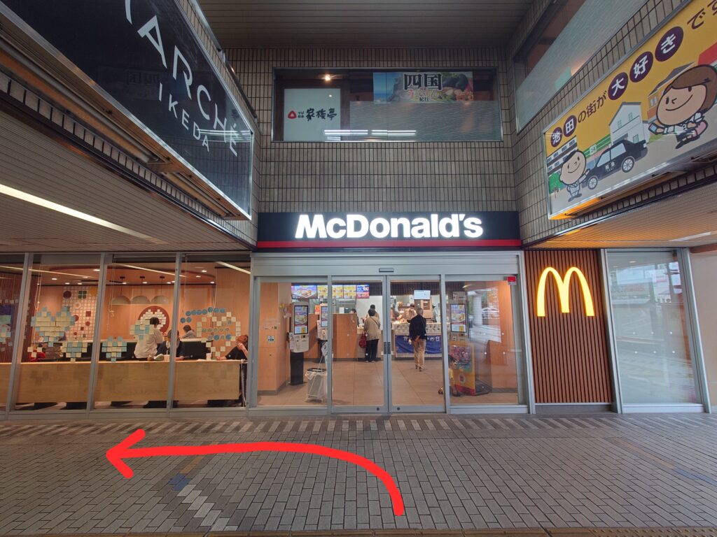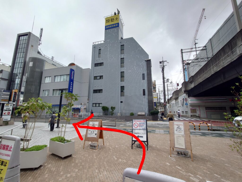 阪急電車でいらっしゃる方は、改札を出て左へ進みましょう。突きあたりに下へ降りる階段があります。
