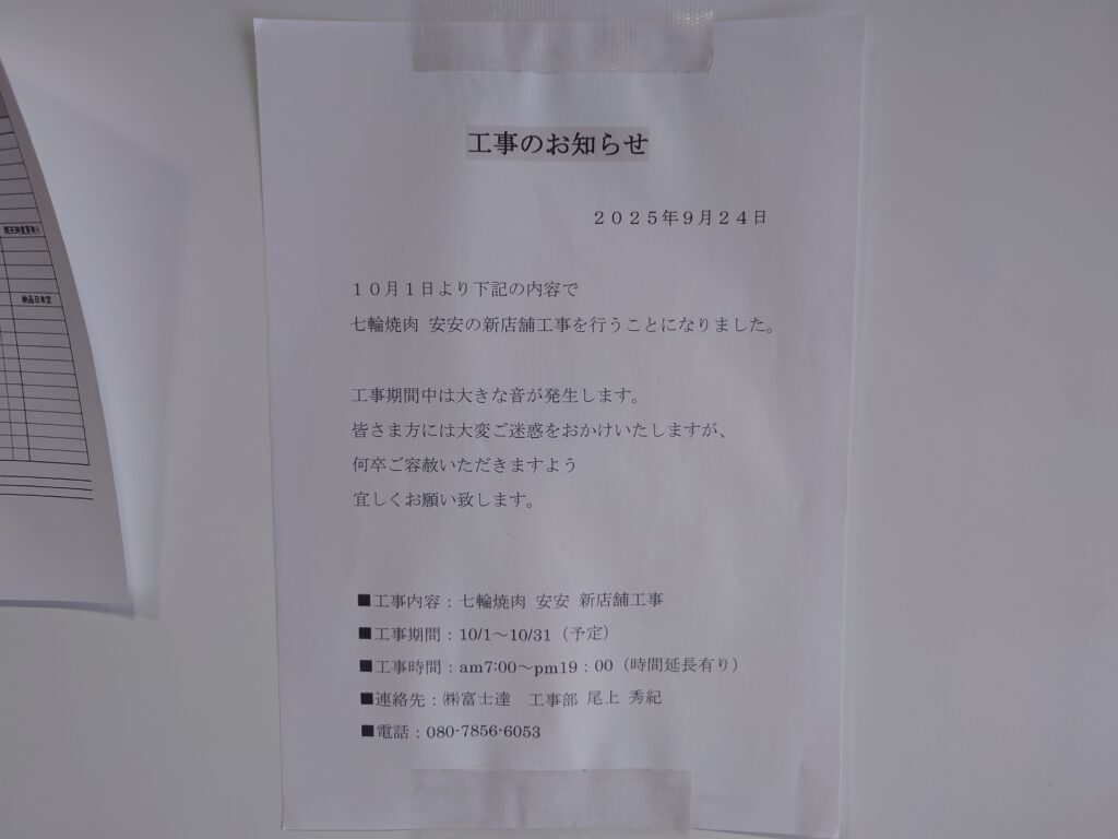 工事の案内がありました。工事期間は10月31日まで(予定)とのことなので、オープンは11月以降ということでしょうか。