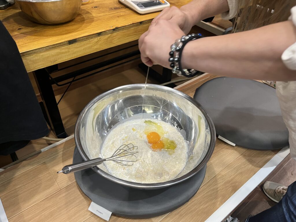 卵、直接、割り入れましたね。本番用はちゃんと別の器に割り入れてから混ぜるそうですw