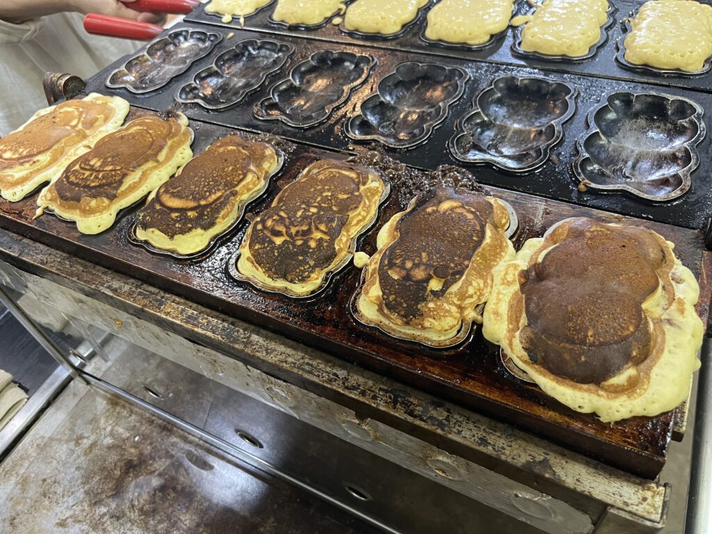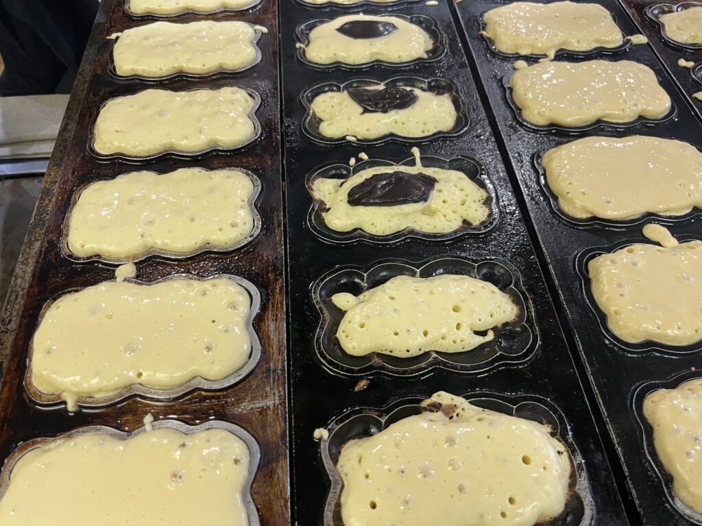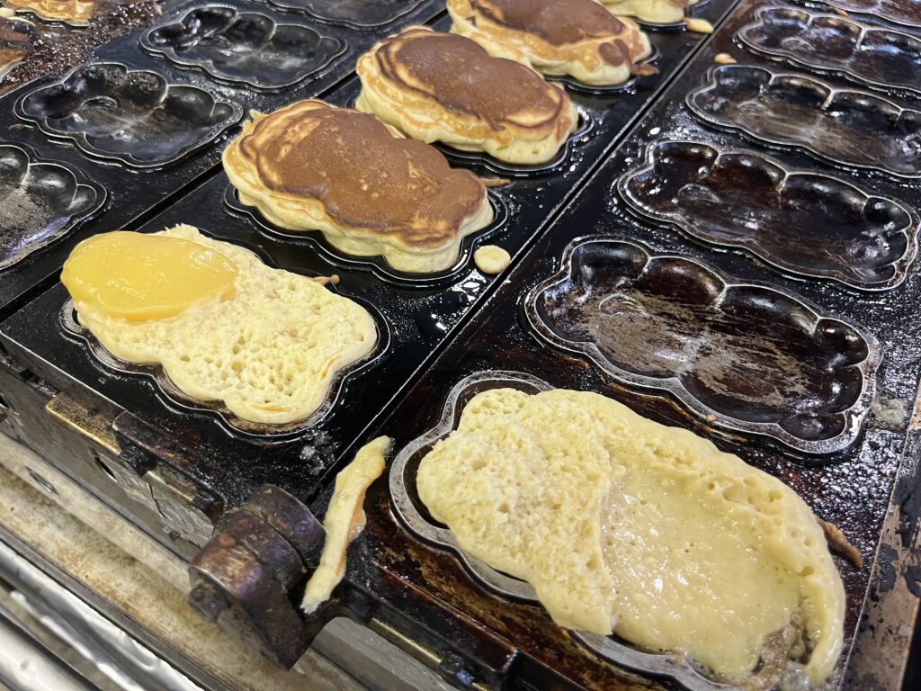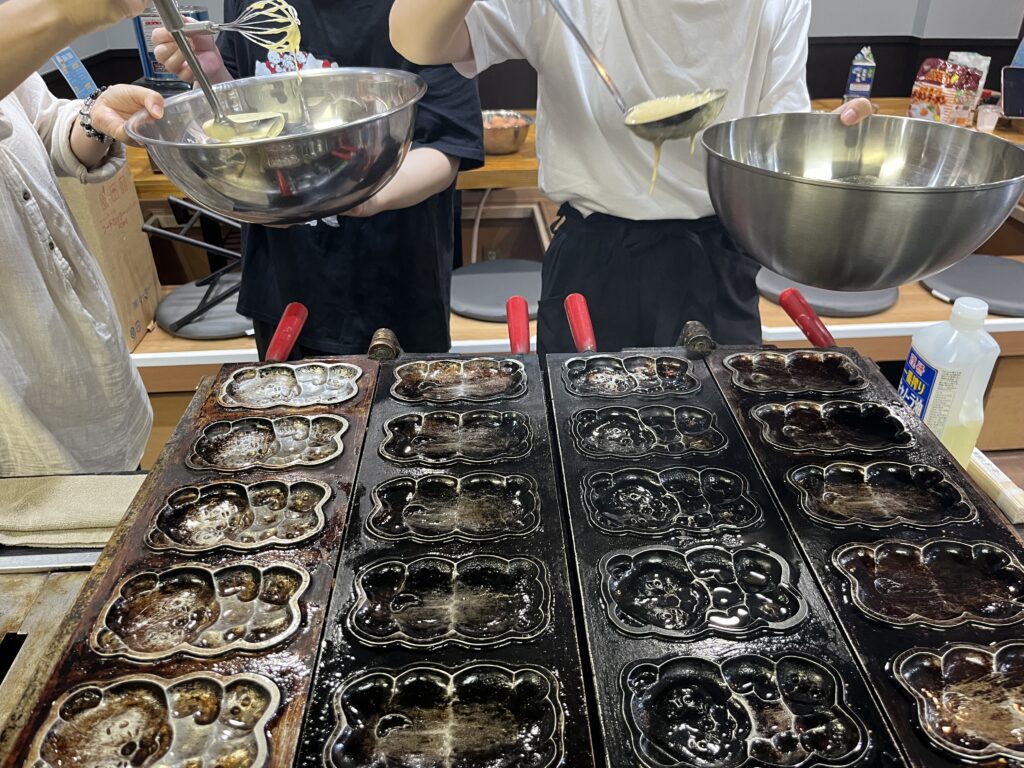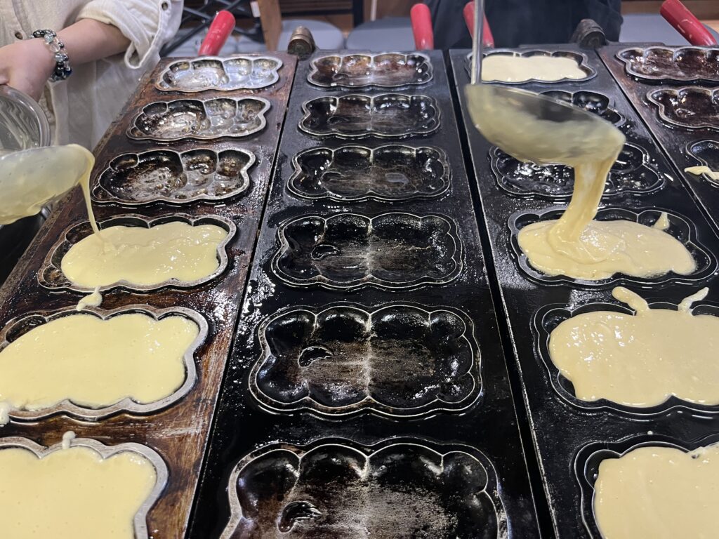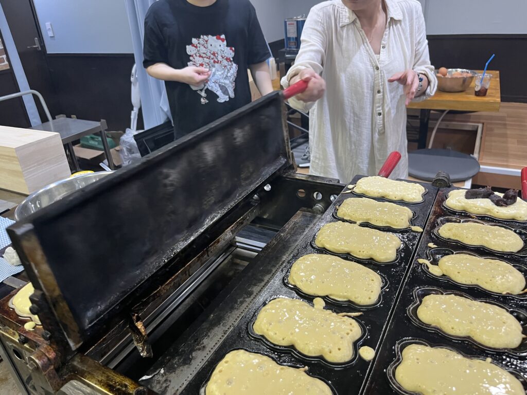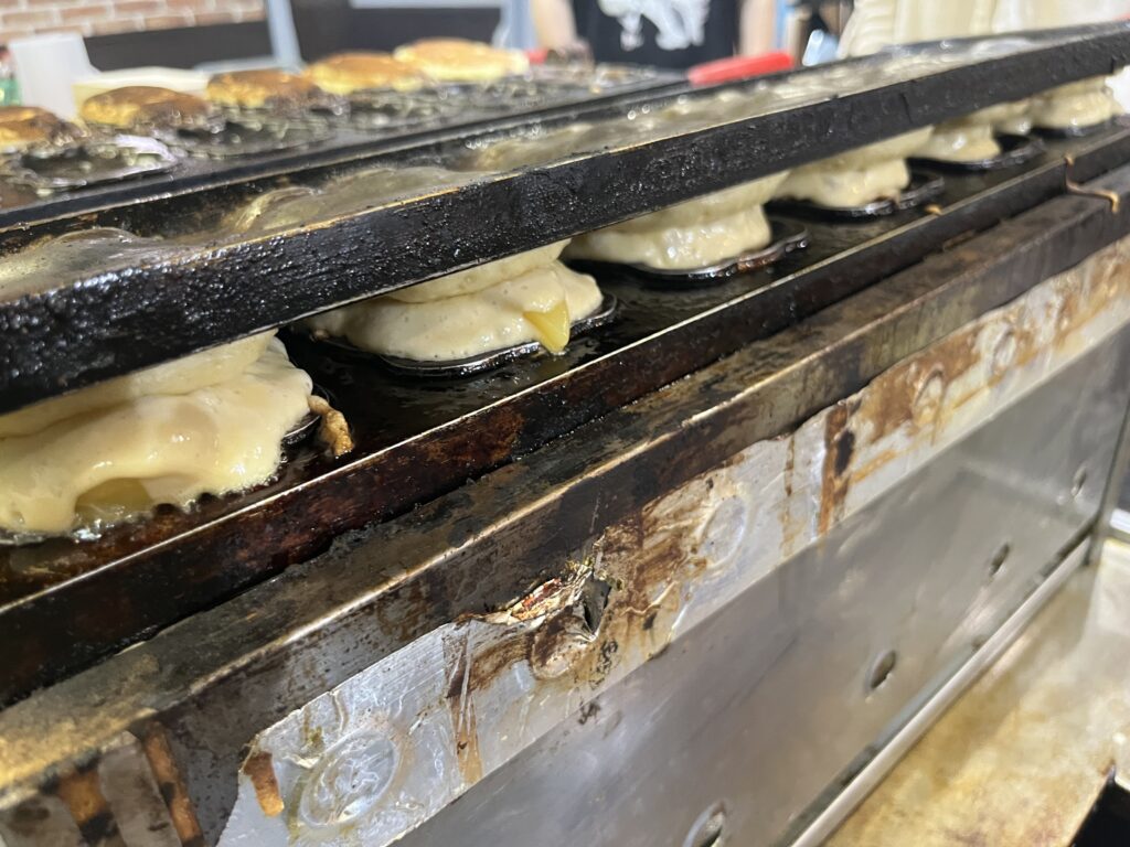 生地をサッと満遍なく適量流し込まないと焼きムラがついてしまいます。