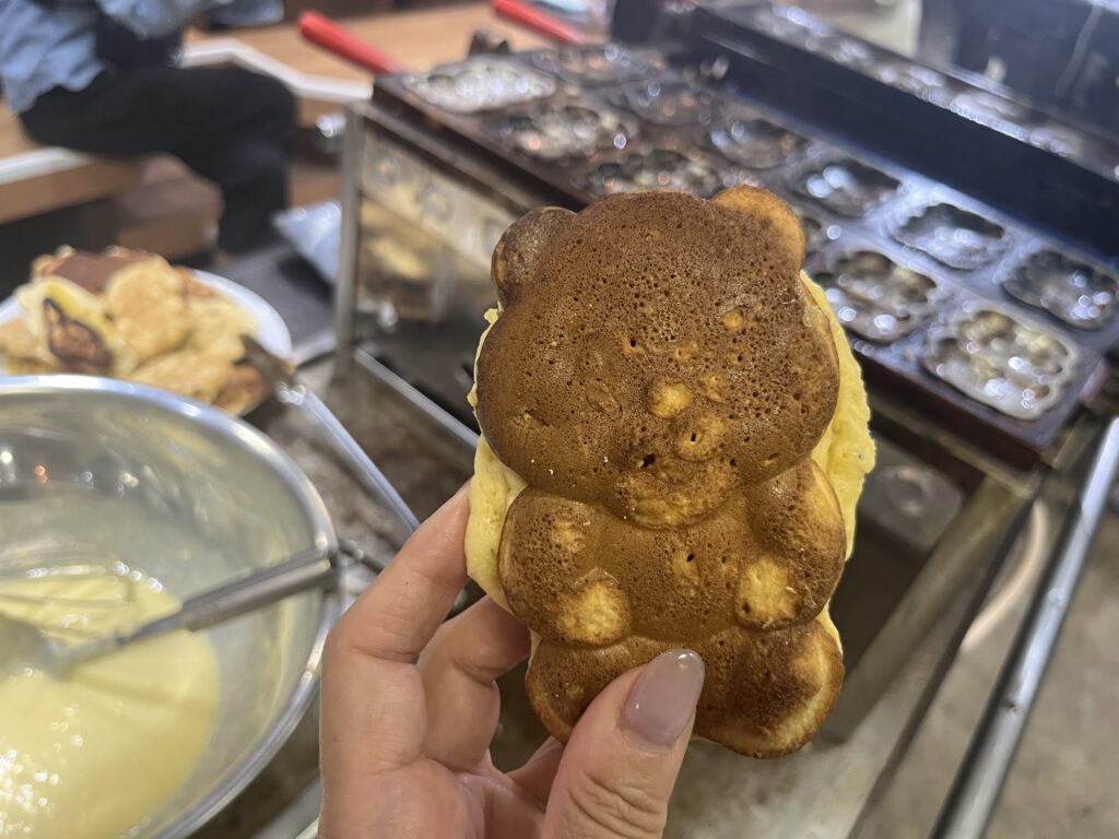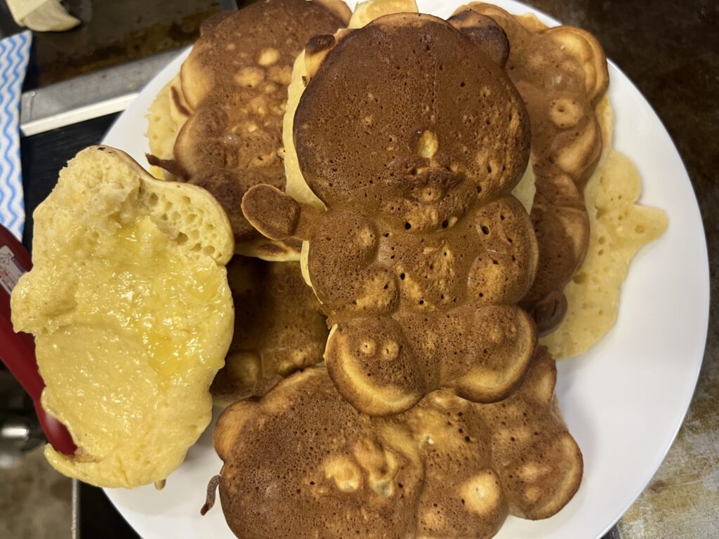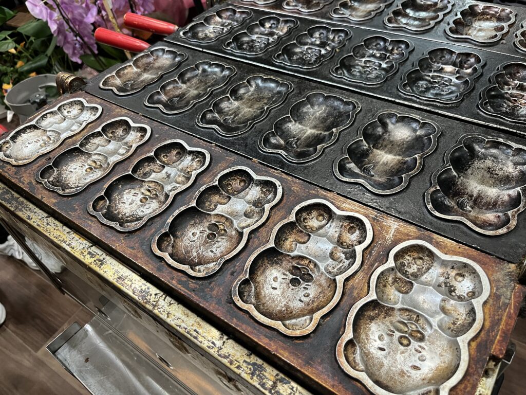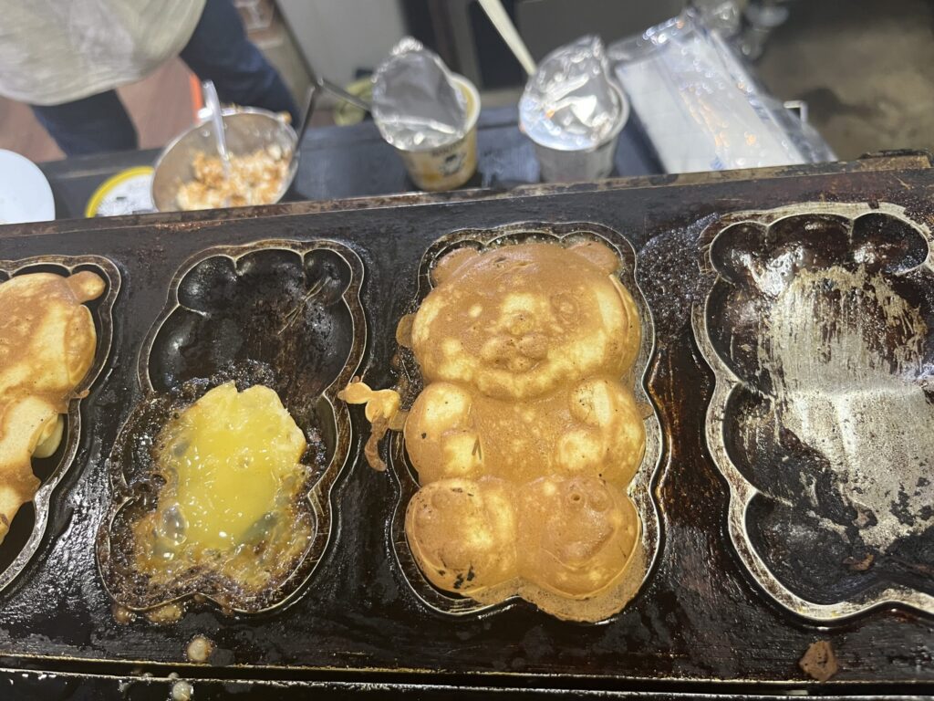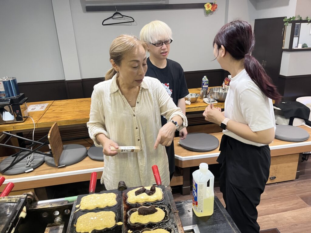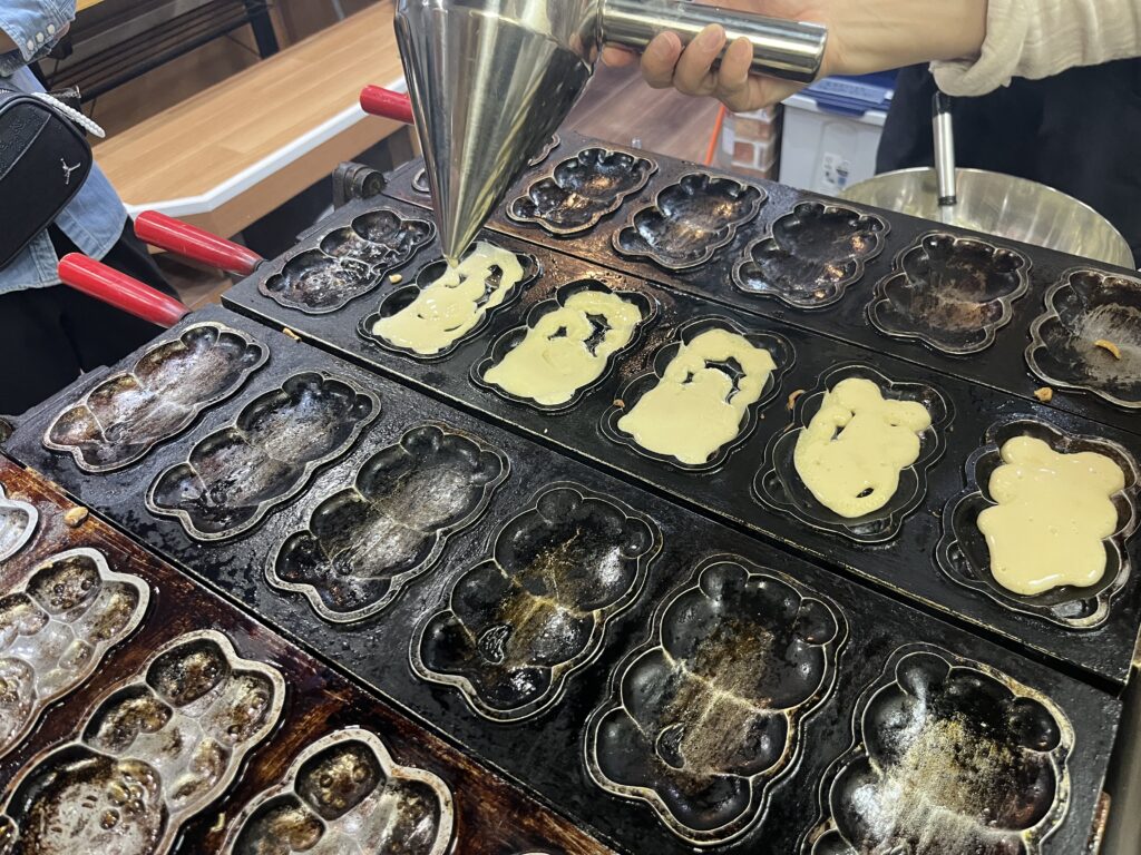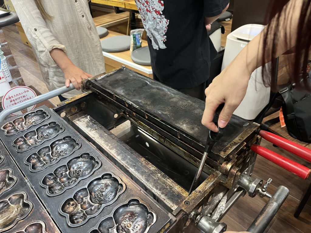 生地をサッと満遍なく適量流し込まないと焼きムラがついてしまいます。