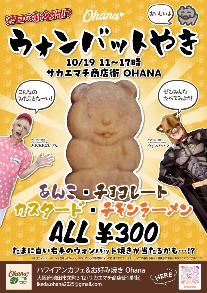 五月山体育館へ向かうにはサカエマチ商店街やさくら通りを抜けて行くのですが、サカエマチ商店街のハワイアンカフェ&お好み焼き「Ohana」ではこの日限定で、鯛焼きではなく「ウォンバット焼き」を限定販売するそうです。