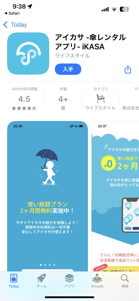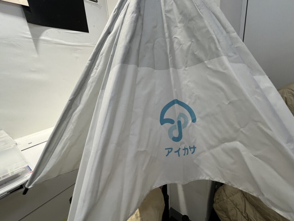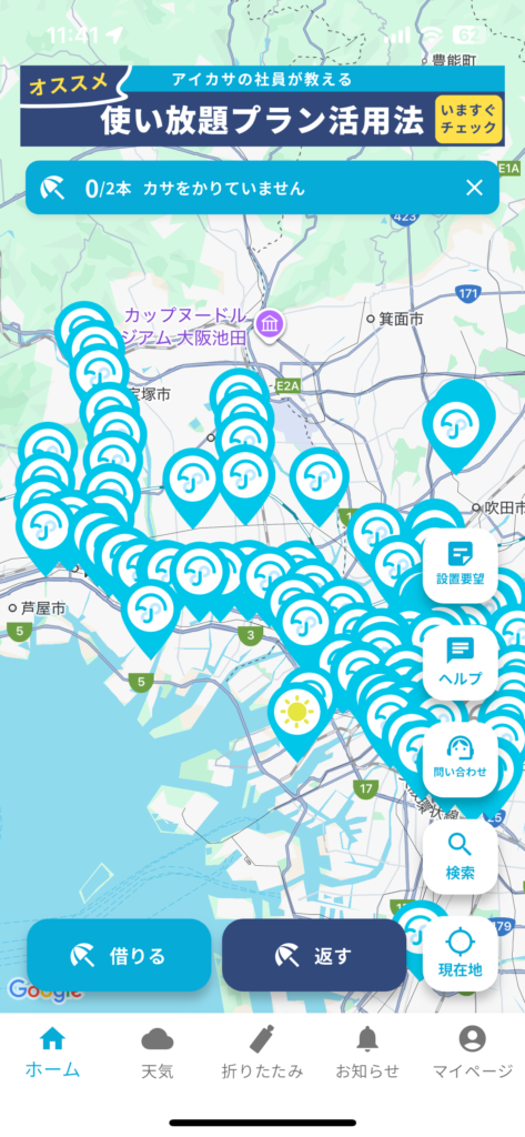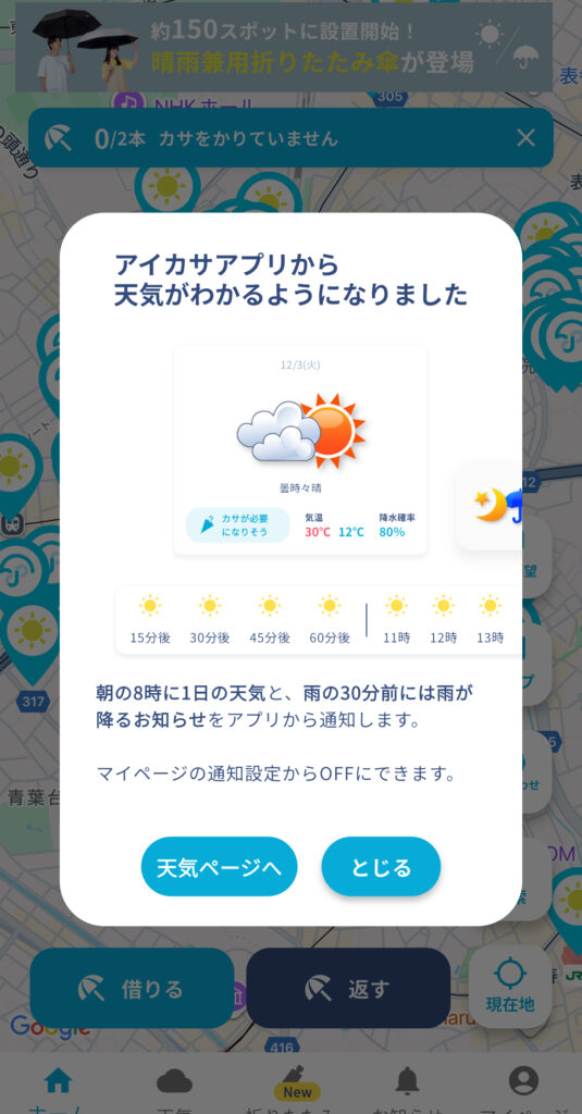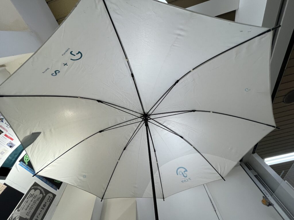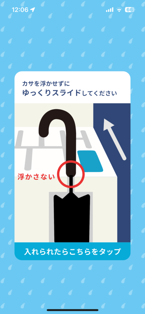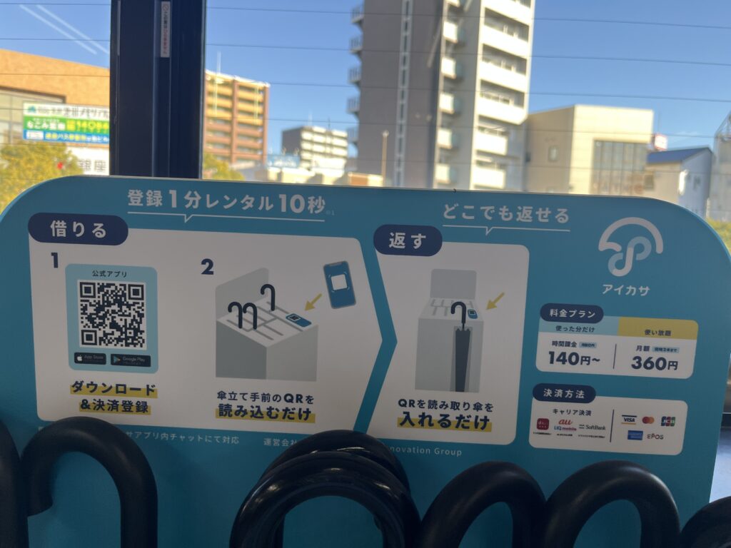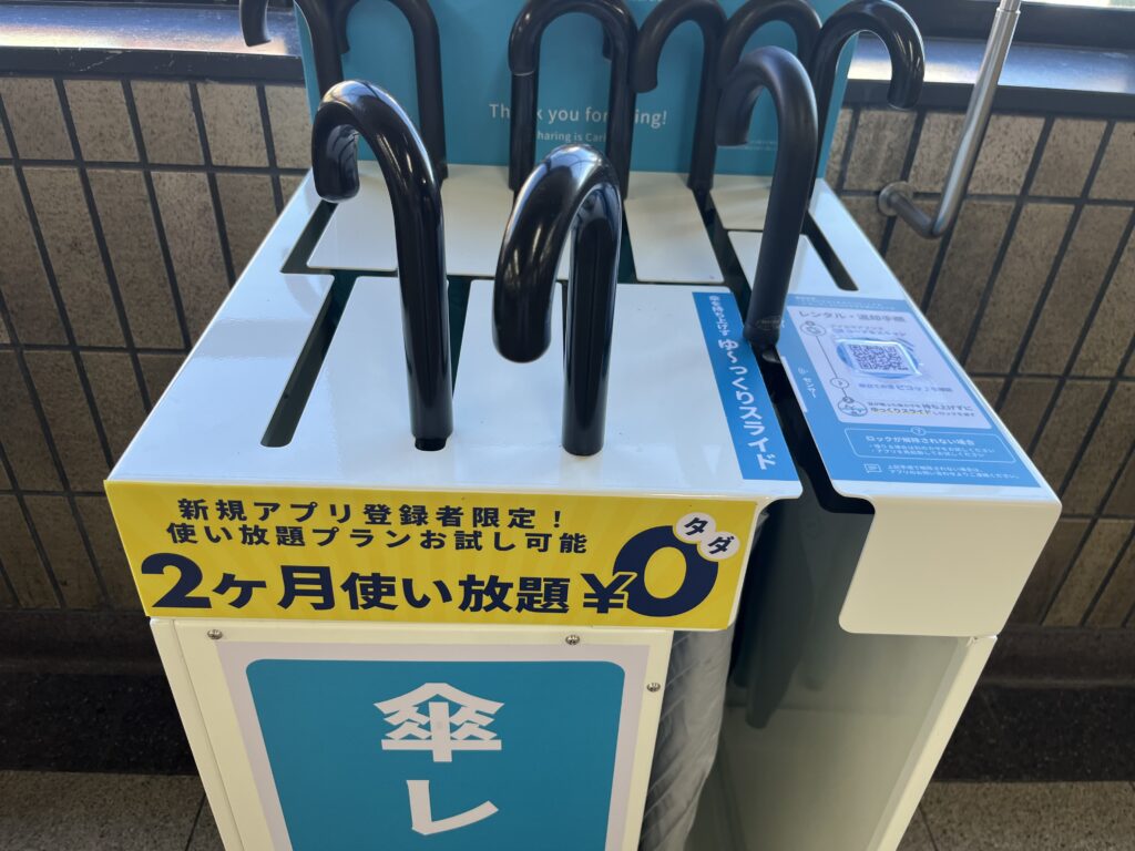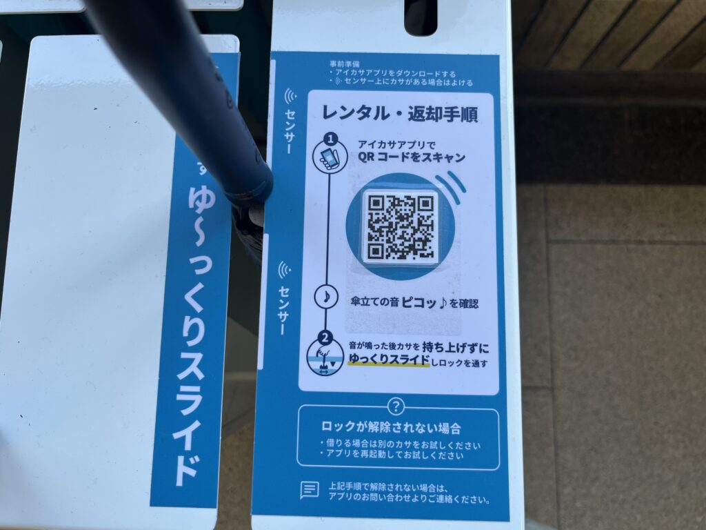 アプリを登録して、こちらのQRコードを読み取って借りてみました。雨は降っていなかったけれど。