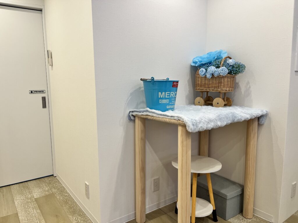 白と水色を基調とした爽やかな店内、早速奥のテーブルにはワンちゃん連れのお客様がおられます。