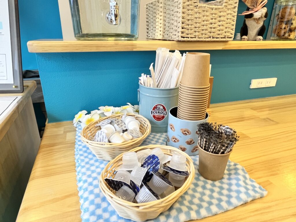 フレッシュや砂糖、お手拭き、水など必要な人はセルフでどうぞ。