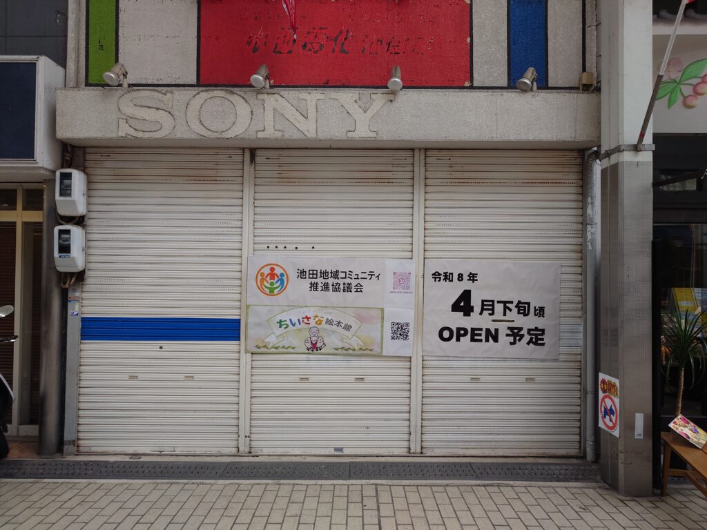 こんにちは、純子@いけほです。阪急池田駅直結のサカエマチ商店街に「ちいさな絵本館」ができるようですよ。場所は以前、小西電化さんがあったところなんですって。