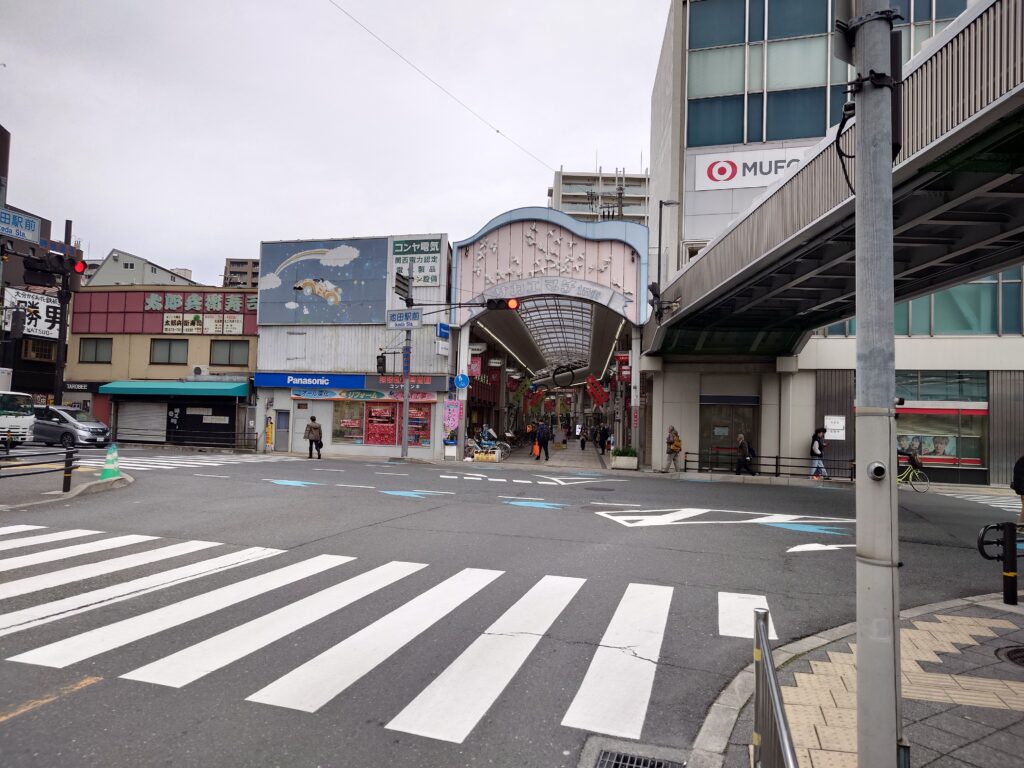 こちらはサカエマチ商店街の入口。写真右上の連絡橋で阪急池田駅とつながっています。
