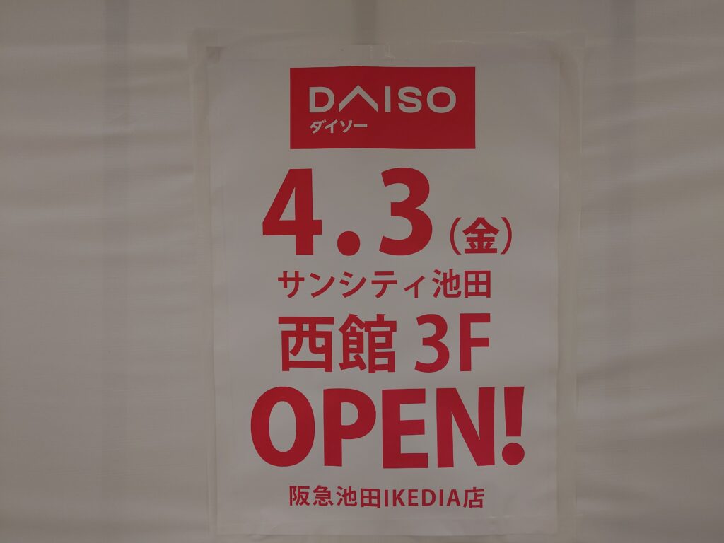 こんにちは、純子@いけほです。阪急池田駅直結のサンシティ池田ビル3階に100円ショップのダイソーさんがオープンするそうですよ。