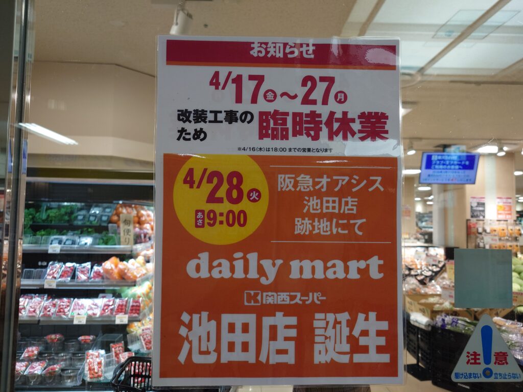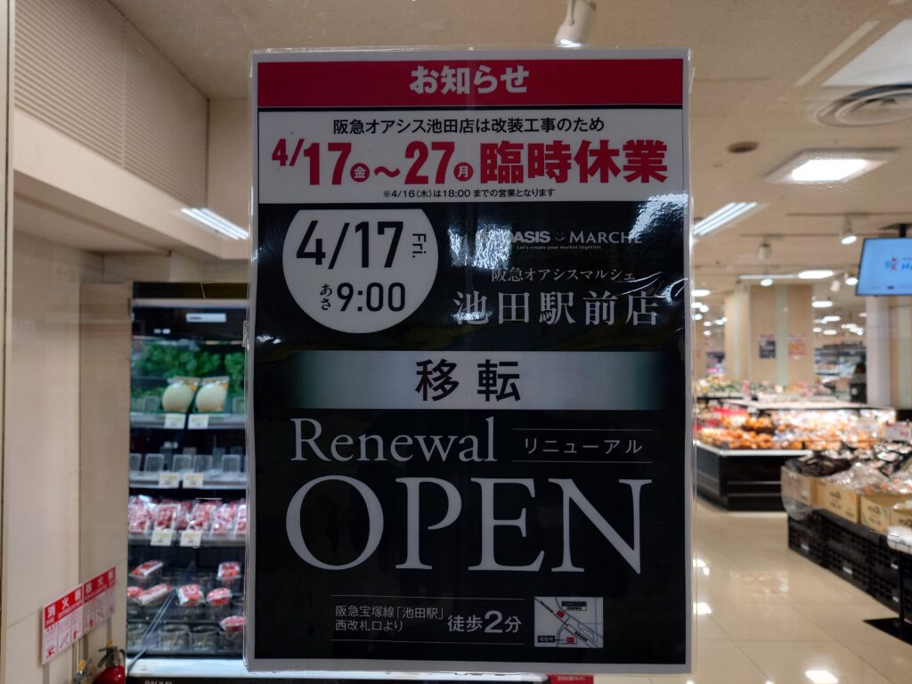 4月17日(金)阪急池田駅前の新しいマンションの1階に「阪急オアシスマルシェ 池田駅前店」がオープンするみたい!/ サンシティ池田B1階からの移転リニューアルです / いま阪急オアシスがあるところには4月28日(火)「関西スーパーデイリーマート 池田店」がオープンするそうです