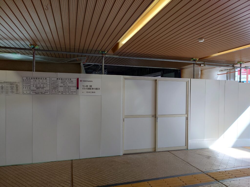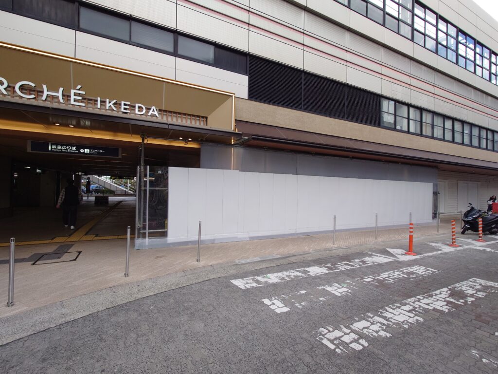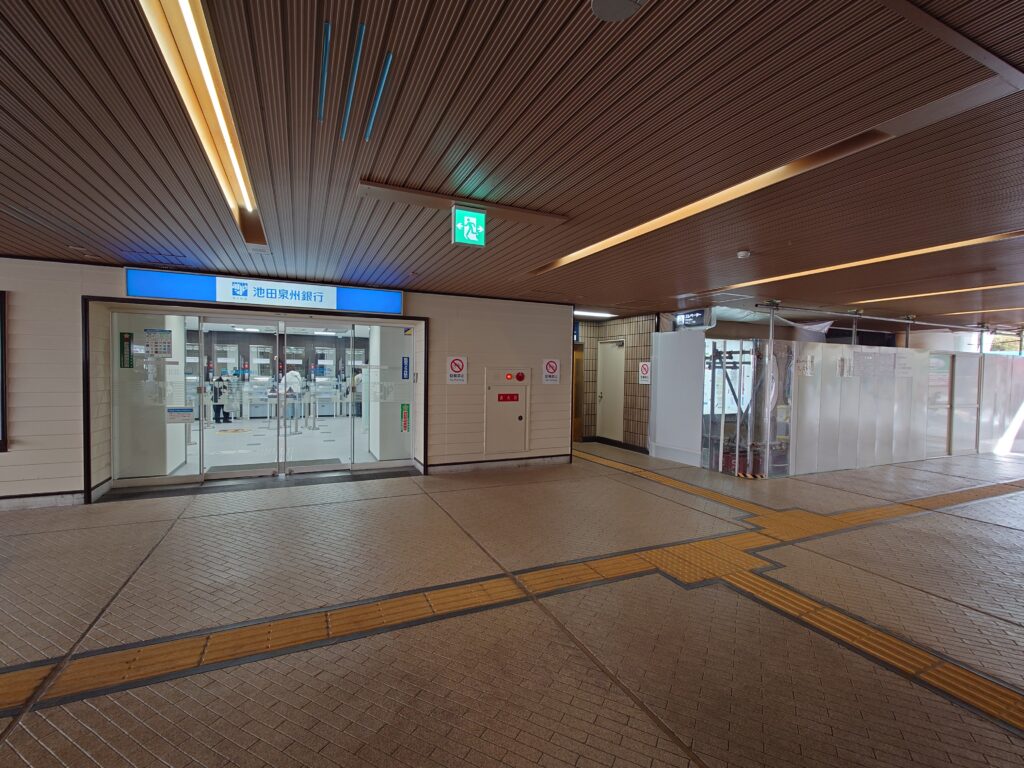 エスカレーターを降りた正面に工事中の場所があります。以前、池田泉州銀行があったところですね。こちらに「健康咲かせる手づくり惣菜 咲菜 阪急池田店」さんがオープンするそうです。
