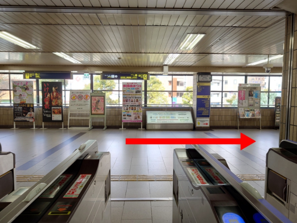 阪急電車で来る方は、池田駅の改札を出て右へ