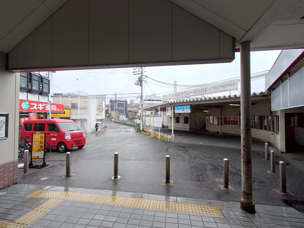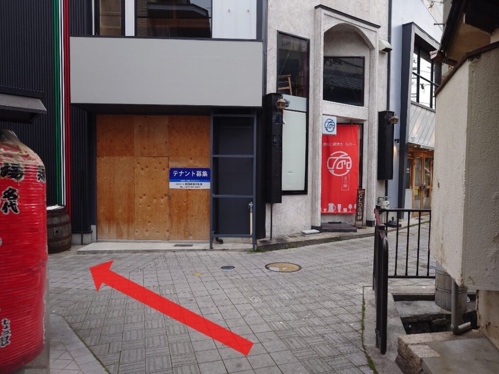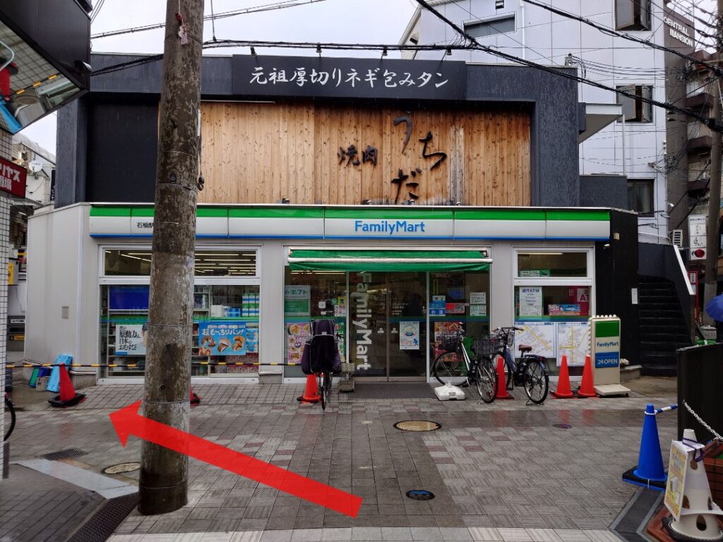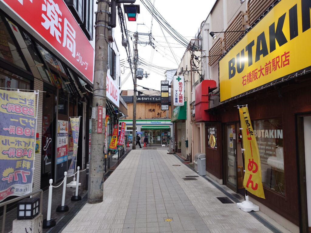ラーメンのBUTAKIN石橋阪大前店とスギ薬局の間を通って、ファミリーマートの前へ