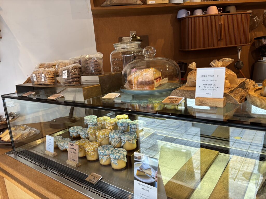 2階のカフェで食べられるケーキやプリンもショーケースの中にあります。